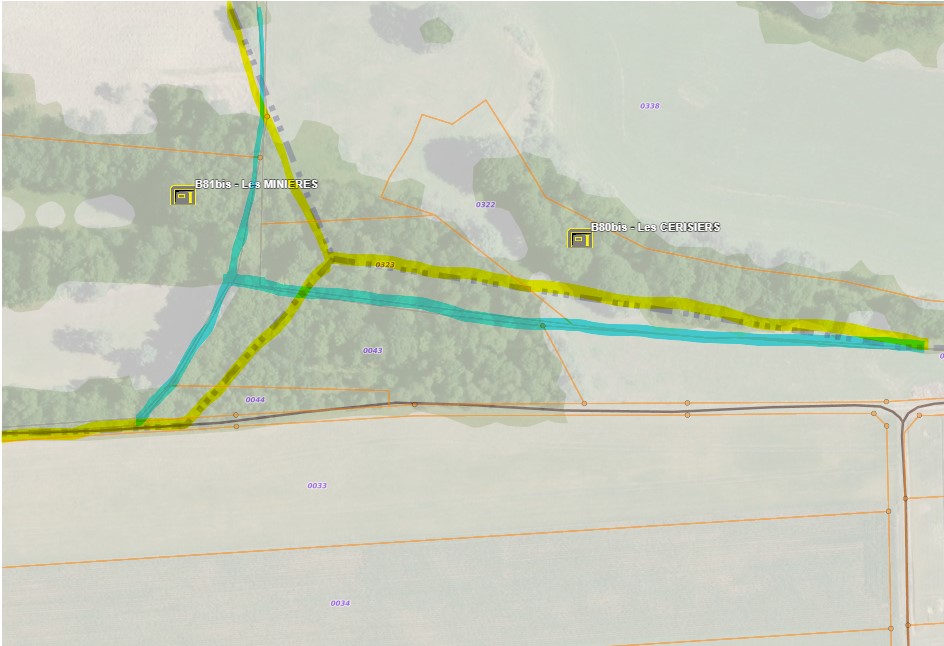En jaune, limite intercommunale de la carto IGN, en bleu, limite intercommunale du cadastre.