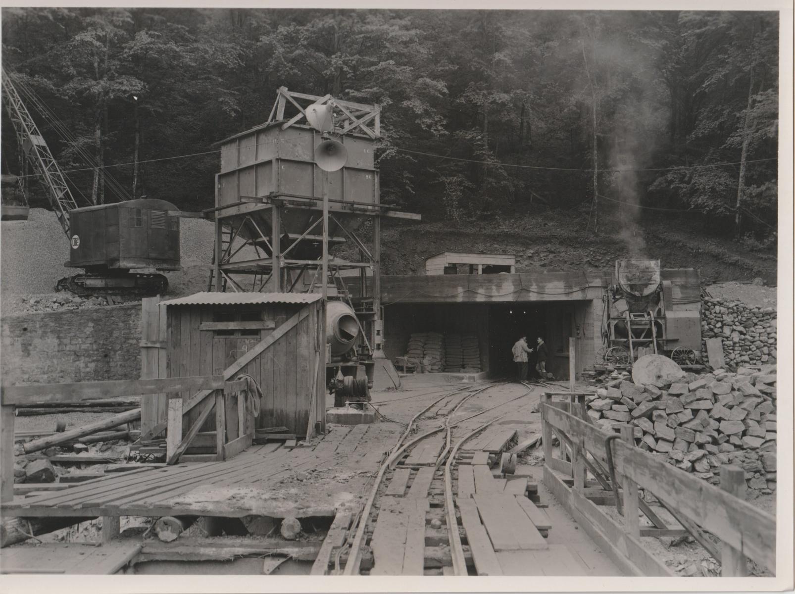 Cette photo est très intéressante pour l'ingénieur en génie civil que je suis (que j'ai été). Elle illustre les choix des différentes méthodes de construction utilisées par les entreprises ayant réalisé les ouvrages. Il y avait ici une centrale à béton au sol, au moins pour l'EM, et des stockages de pierres, alors que dans d'autres (Galgenberg, ..) les matériaux (pierres et béton) étaient descendus depuis le sommet, semble-t-il, amenés vers les puits par télébennes.