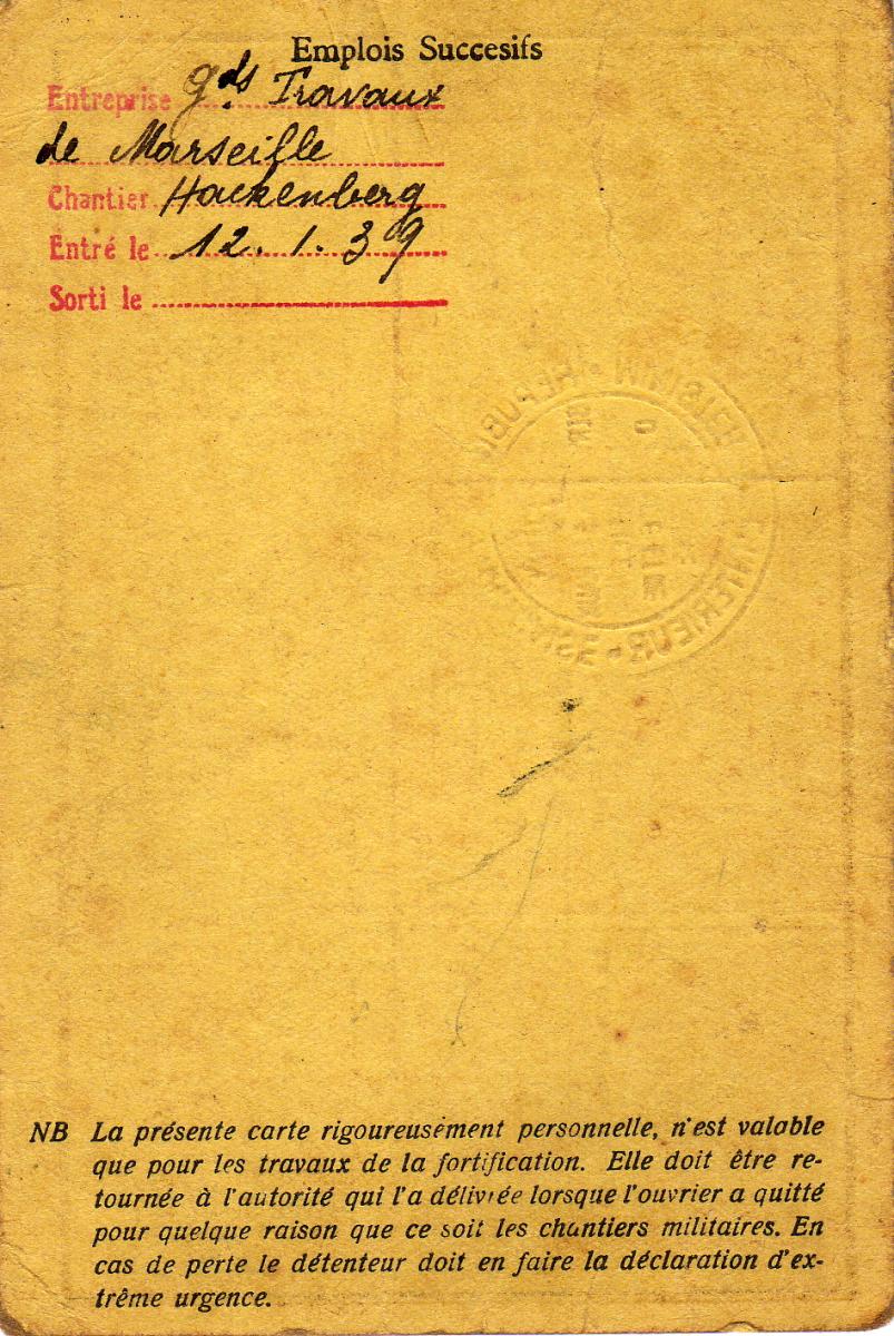 - pour le Hackenberg, j'ai juste la carte d'identité des Fortifications qui donne accès à Pierre BRIAND, pour les "Grands Travaux de Marseille" au secteur "Hackenberg", en 1939, mais je ne sais pas pour quel motif...