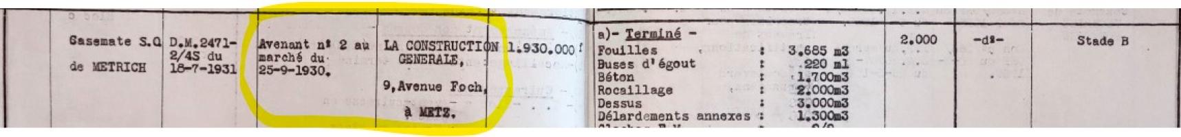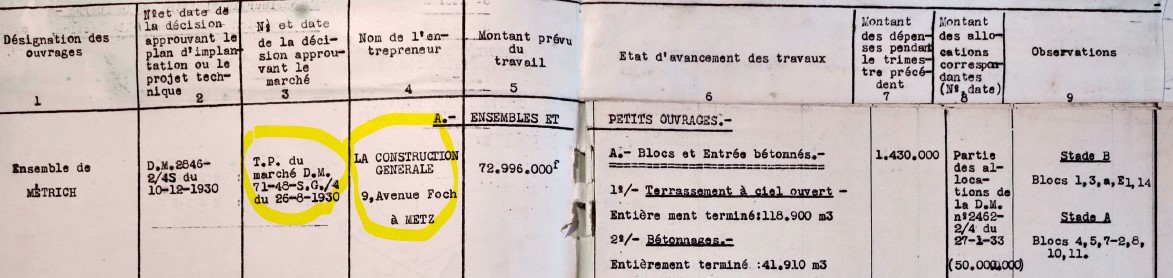 Oui, bien sûr. Ces informations sont tirées de rapports de chefferies des travaux de fortification sur l'avancement des chantiers. Ci-dessous un exemple pour Métrich, extrait du rapport 13/S du 08/01/1934 envoyé par le Lt-Col Schemidraire (cdt de la chefferie de Metz-est) à Paris. On y trouve naturellement les mêmes informations pour les casemates ou abris des différents secteurs. C'est une source précieuse pour suivre les entreprises en charge des travaux durant la grande période des travaux initiaux.