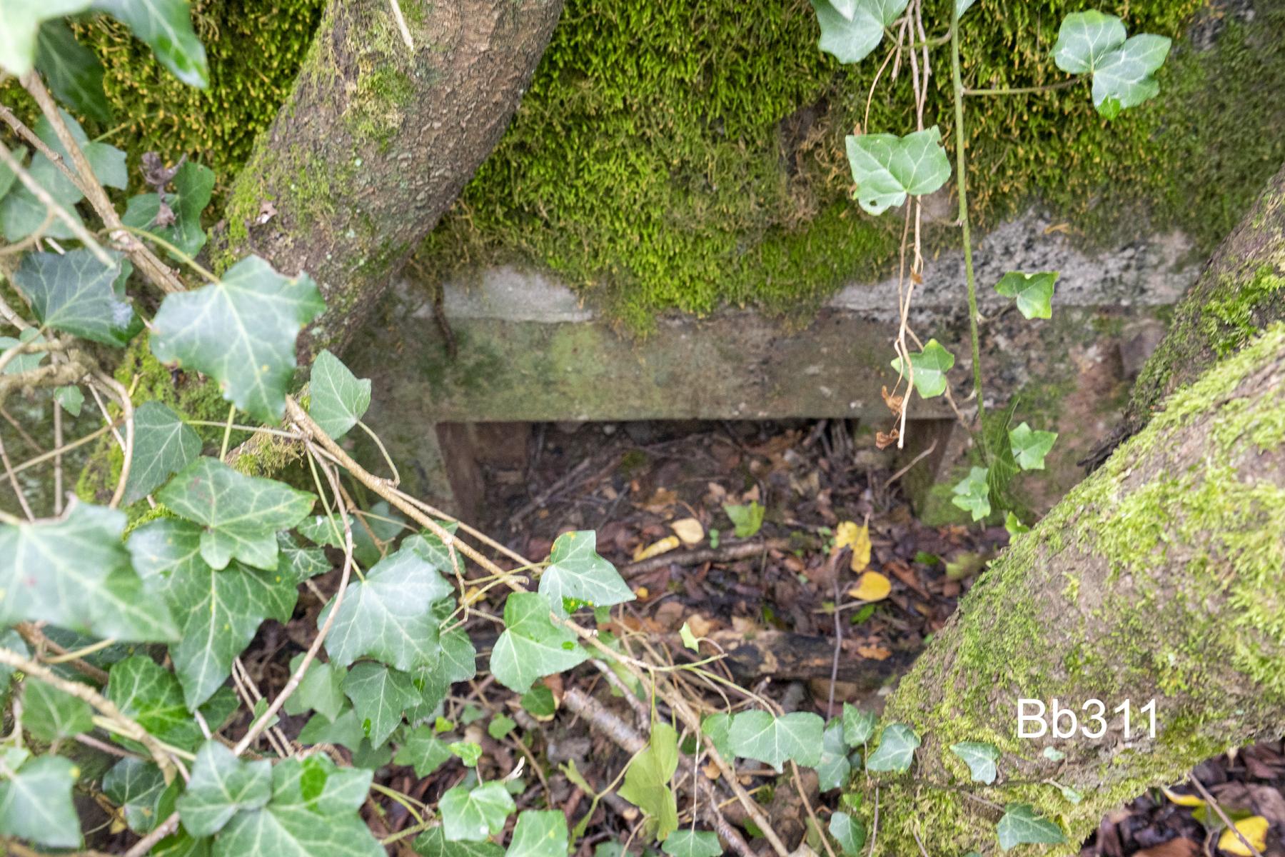 A mon opinion l'ouverture du créneau n'est pas assez large pour un canon. Le(s) entrée(s) sont remblayé(s) donc l'embrasure est la seule référence. Il est pointé vers l'est, direction Bb12, plutôt frontal. Le créneau est comparable avec celui du Bb311 qui est un blockhaus infanterie.