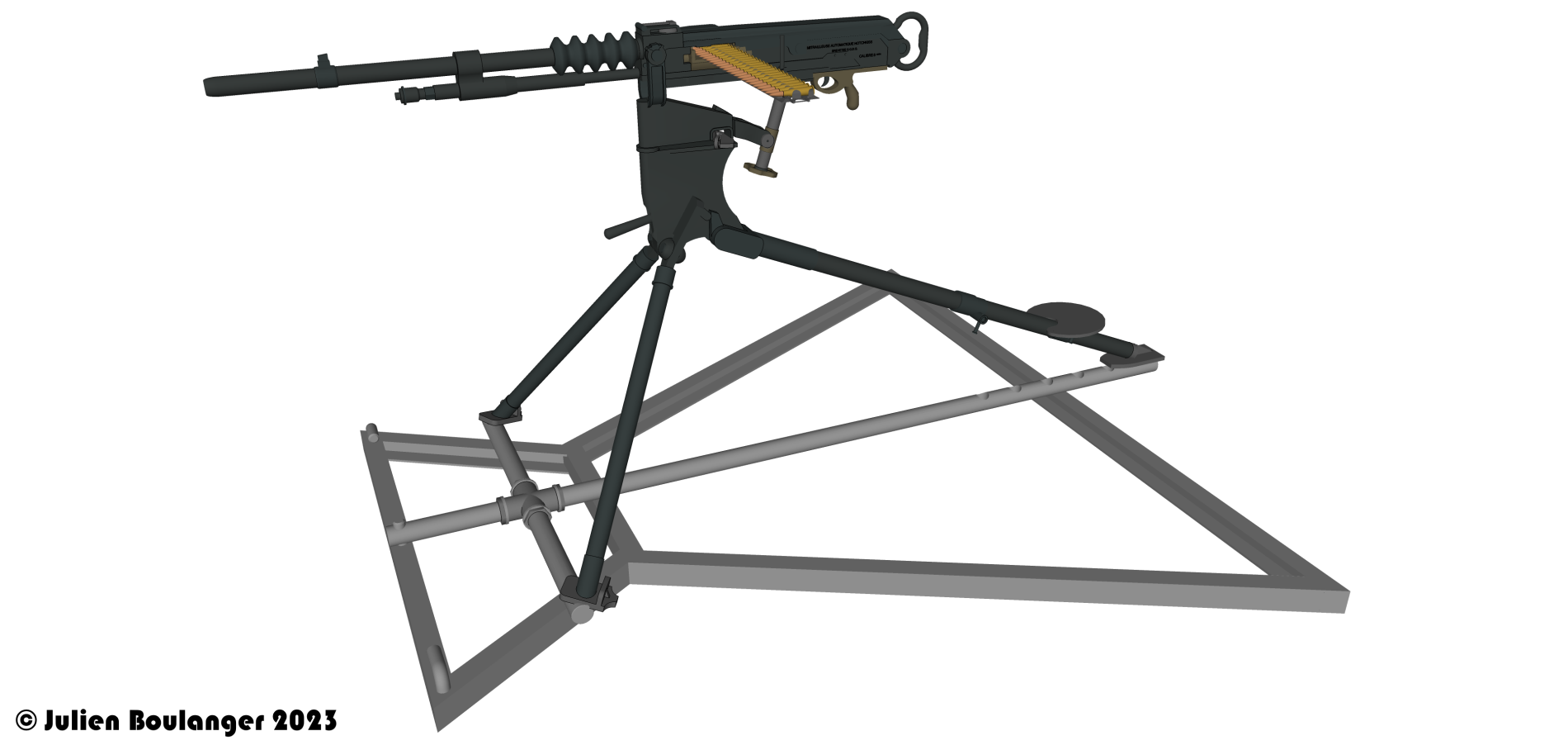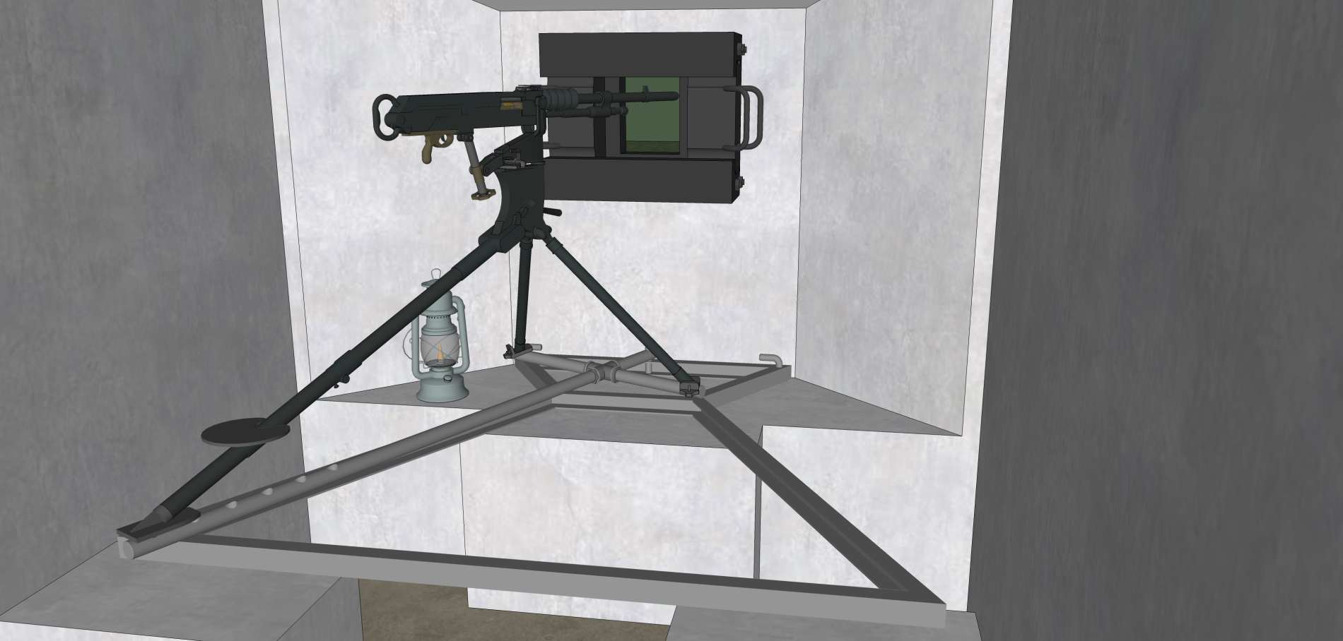 Je relance le fil pour montrer ce que j'ai pu sortir avec le plan du dispositif visible plus haut. Je reste ouvert à toutes remarques/éventuelles suggestions de modification. La Hotchkiss semble rentrer pile poil dedans, néanmoins en l'installant dans le blockhaus, le débattement maximal est +/-25° pour la Hotchkiss (sinon, on tire sur la trémie...) et +/- 30° pour le support mobile.