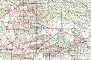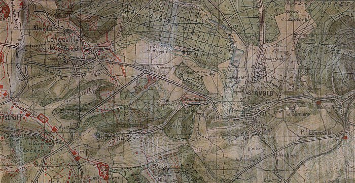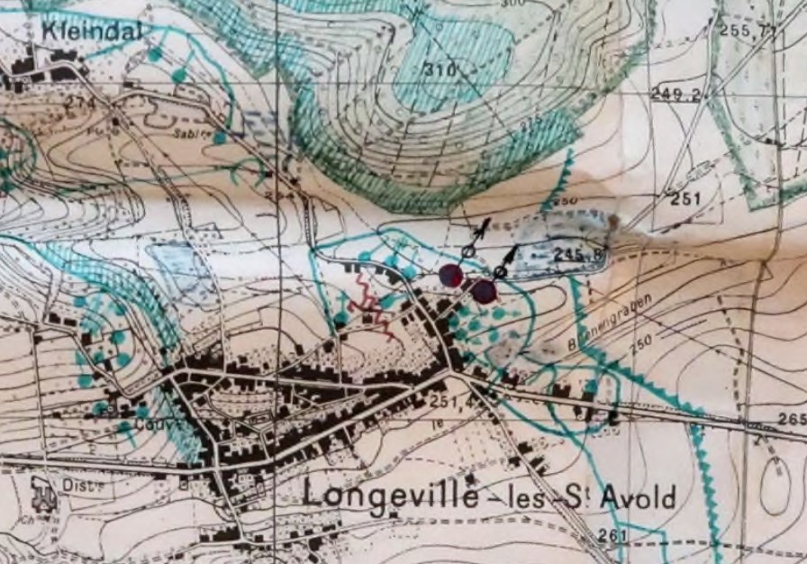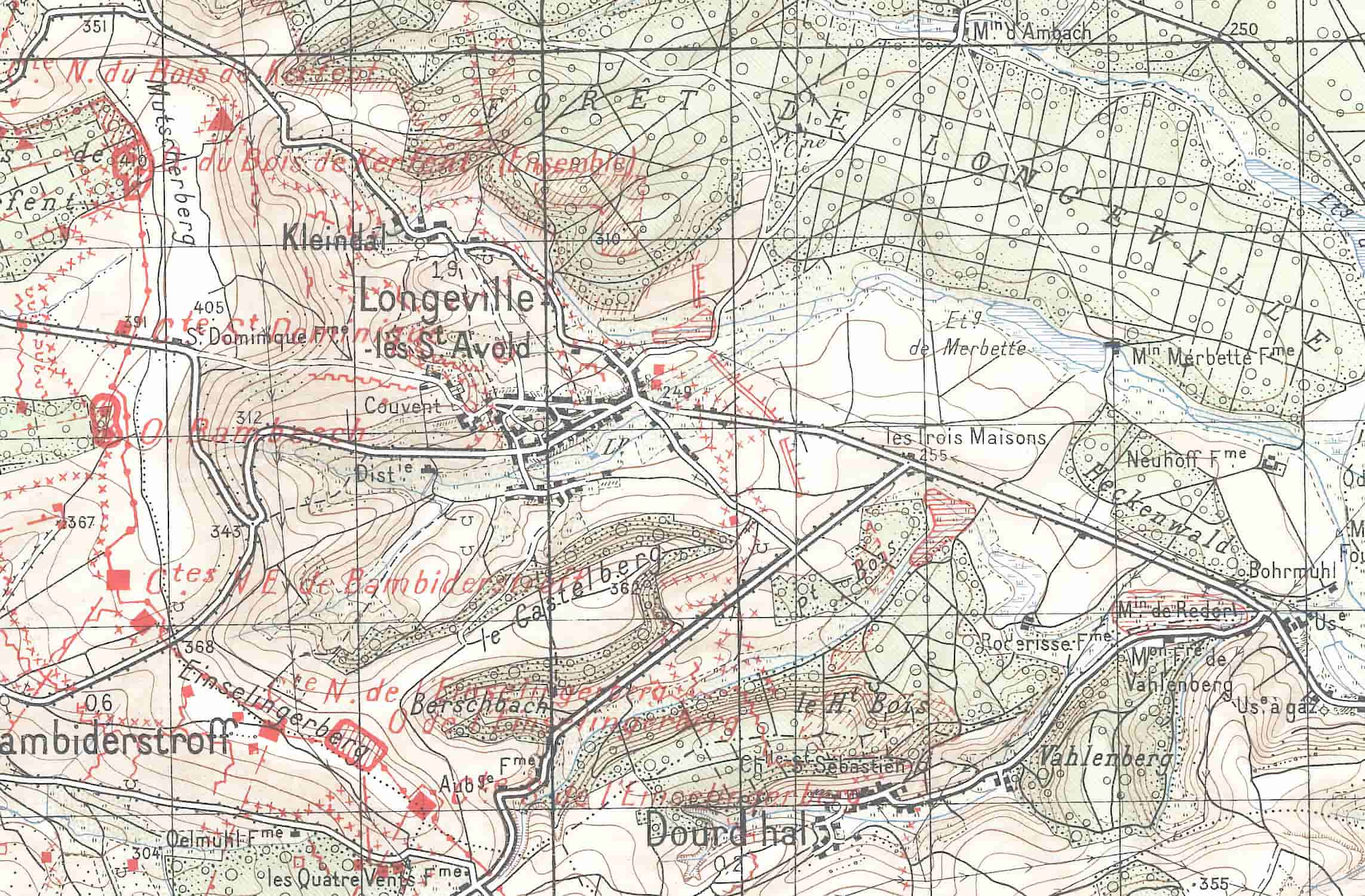 Cette carte (voir extrait ci-dessous) est non datée, mais se trouvait au milieu d'un jeu d'autres cartes qui sont elles datées du 15 mars 1940. Outre une mise en évidence des importants travaux de campagne réalisés à la lisière est de Longeville (positions de tir, trous d'hommes, abatis en lisière de forêt, ...), elle nous apporte plusieurs informations intéressantes :