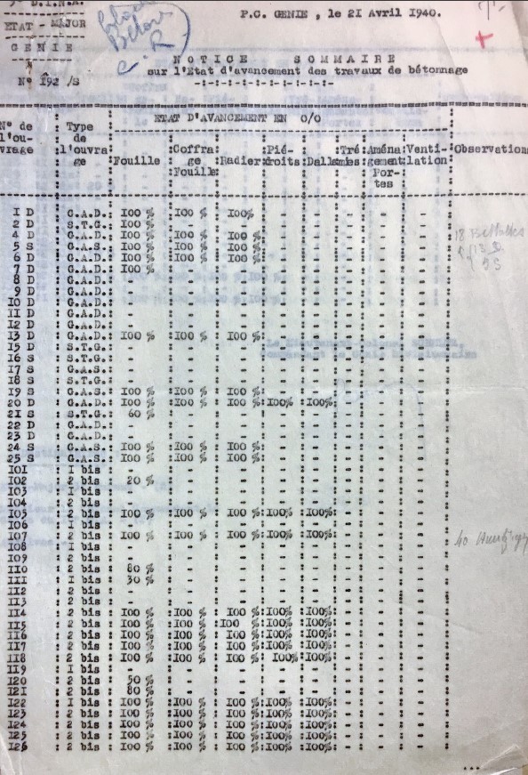 Il existe des relevés d'avancement de travaux du 10° CA qui donnent pour ces blocs tardifs une numérotation à deux puis trois digits numériques simple pour les STG campagne type 1bis ou 2 (de 1 à 41 sauf 40 initialement, décalés dans les 101 à 141 pour ne pas faire doublon avec les blocs d'avant-guerre qui sont entre 1 et 100), et une numérotation alphanumérique en xxD et yyS (de 1 à 25 S ou D sauf 14) pour les gros blocs STG ou STG-FCR doubles ou simples. Nous sommes par contre dans la difficulté pour faire le rapport entre cette numérotation et les blocs qui ont effectivement été construits ou en chantier en mai 1940. Voir ci-dessous à titre d'exemple l'un de ces relevés de travaux de la 3° DINA fin avril 1940 (sous-secteur de Mouzon).