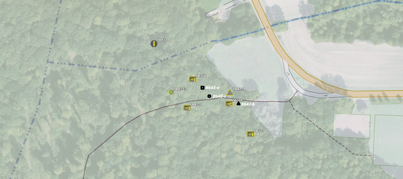 Je voudrais préciser les positions des différents blockhaus au sud des blocs du Michelsberg (Bb43 et 42). Je les ai replacé sur un extrait de carte en fonction du chemin forestier. La cuve pour canon se trouve juste à côté du chemin, le Bb43-d entre la cuve et le bloc STG type 1. Bb42-b à l'angle du gros bloc canon.