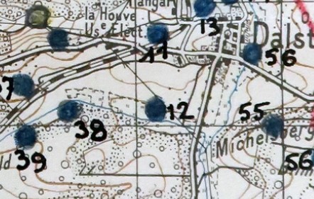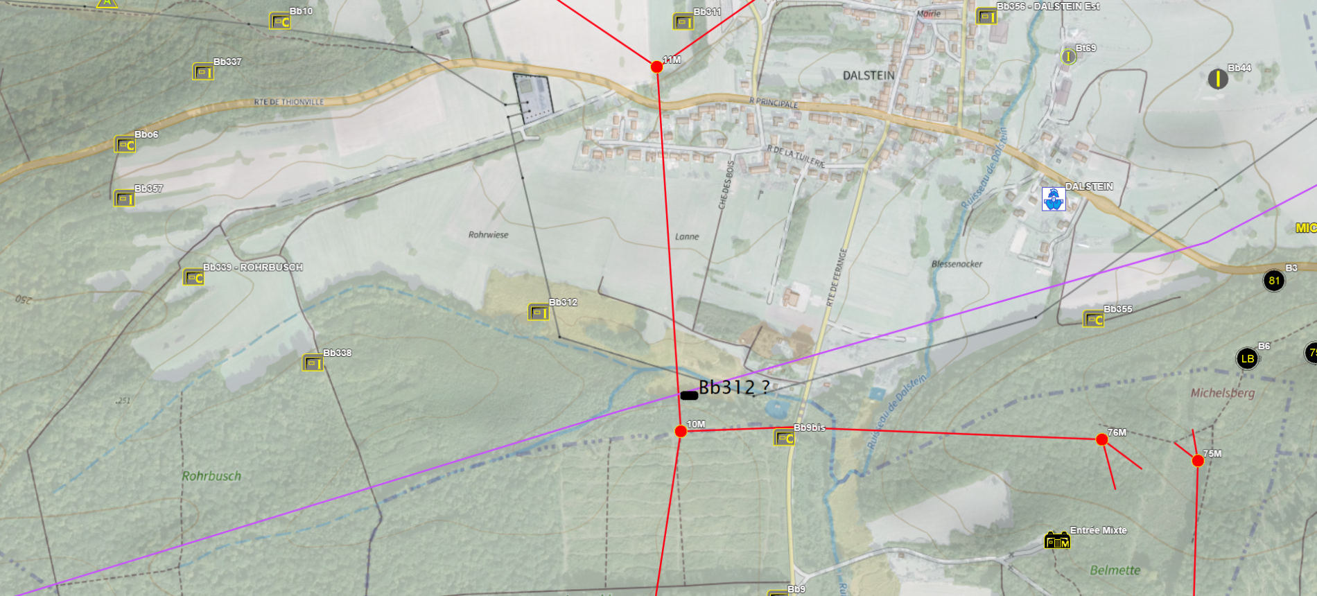 Si cela peut aider pour les deux blocs "non trouvés", voici un extrait de carte renseignée des travaux du CAC qui les montre. 312 serait donc plus à l'est dans un des bosquets entre sa position actuelle et la route Dalstein-Férange.