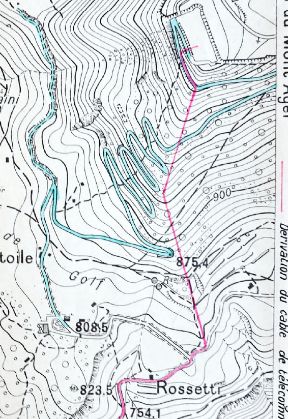 Par contre de nombreux travaux ont été réalisés entre 1956 et 1960 dans le cadre du transfert du complexe à l'armée de l'Air pour le centre de détection. J'ai trace d'une part du tirage d'une dérivation souterraine vers le fort de la ligne du réseau LSGD Nice-Vintimille en même temps que l'installation d'une ligne OTAN spécifique, ainsi que l'installation d'une nouvelle ligne électrique d'alimentation du complexe (l'usine Maginot était trop faible et a été démontée à cette occasion, et la ligne aéro-souterraine d'avant-guerre insuffisante) d'une tension minimale de 10-15 kV. La dérivation LSGD était enterrée à 80cm en tranchée sur l'essentiel du parcours, qui partait de Rosseti et montait au réduit côté est des lacets de la route (voir ci-dessous). Concernant la ligne électrique neuve, j'étais persuadé d'avoir vu un plan de son tracé et des détails de son entrée dans le Réduit dans le carton d'archive de l'ATG Nice (4V1096), mais n'arrive pas à remettre la main dessus. Peut-être me suis-je abstenu de photographier ces éléments liés à ce qui me paraissait hors sujet (armée de l'air et après guerre...).