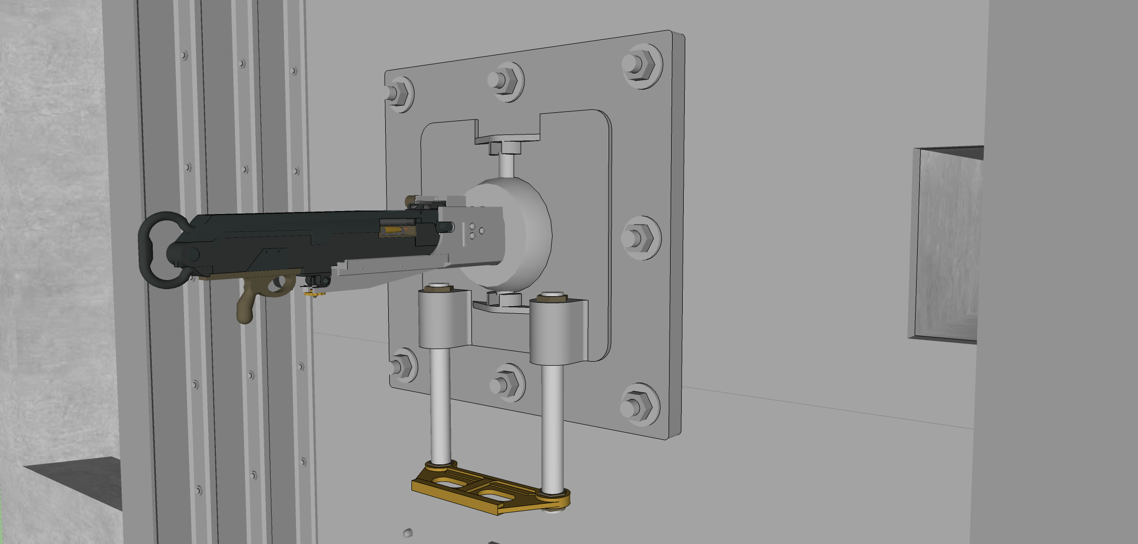 Je viens de voir les nouvelles version du montage pour Hotchkiss. Pas mal du tout. Il reste mon commentaire sur la rotule qui a en réalité une saignée verticale en diabolo pour permettre le débattement haut-bas de l'arme autour de l'axe horizontal du carter installé dans la rotule. Tel que dessiné actuellement, l'arme ne peut pas bouger en site ;-)
