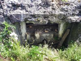 Mais pour Trambach, on distingue en partie le piédroit d'une entrée à l'arrière. A l'instar des blocs antichar du secteur, on retrouve également des réservations pour une trémie non posée sur le créneau. Jusque là on pourrait avoir à faire à un bloc antichar mais la présence d'un conduit d'évacuation et d'une fosse à douilles me laisse perplexe (photo 1).