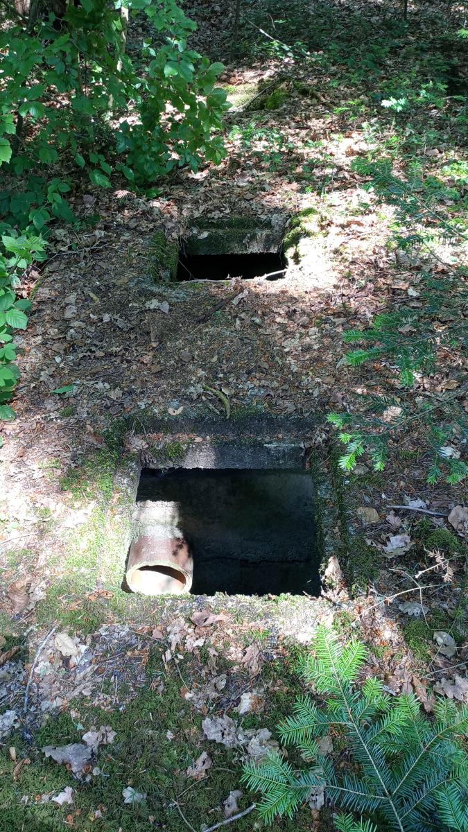 - bloc sanitaire (?) trouvé avec 5 "places" (c'est souvent le cas dans les fortifications allemandes tant avant 1914 que dans le mur de l'atlantique). En-dessous des "fosses" cloisonnées avec un système de décantation de l'une vers l'autre.
