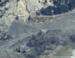 St Antoine Annexe est potentiellement une bonne candidate. Ci-dessous un scan de diapo prise dans les années 80 depuis le Sapey. Cela donne une idée. La difficulté est que le terrain a aussi changé dans la zone du torrent car il a été canalisé à l'époque. Il y a maintenant une digue entre la casemate et lui. Le chemin qui monte vers les tufs me parait néanmoins plus haut là que sur la photo d'époque. Mais cela peut provenir d'une effet zoom.
