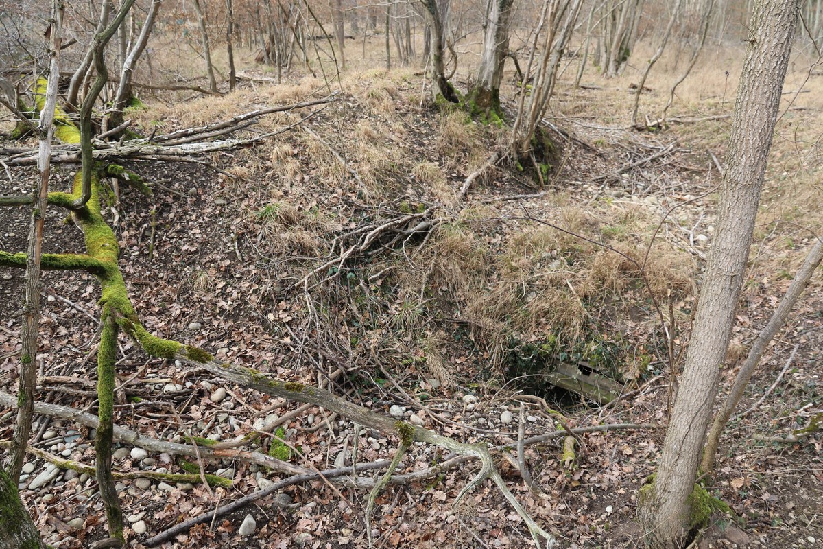 En bout de forêt vers le Nord, et probablement au début vers l'Est, une position d'artillerie préparé avec réemploie de d'abris ex-allemands.