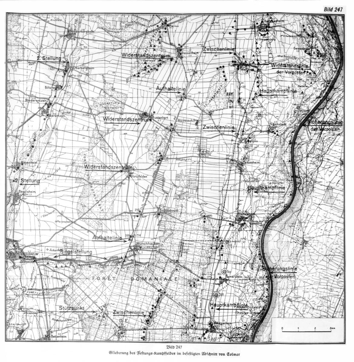 La Befestigungskarte allemande de 1938 (voir ci-dessous) ne montre rien dans ou à la lisière du Hardtwald, ce qui n'est pas surprenant car si fortif il y a eu, elle est probablement très tardive. Pour bien faire il faudrait la Befestigungskarte de 1940, mais cela nécessiterait d'aller aux archives de Fribourg. Il est vrai que ce bois a été préalablement fortifié par les Allemands durant la période d'annexion, ce qui ne rend pas les choses faciles.