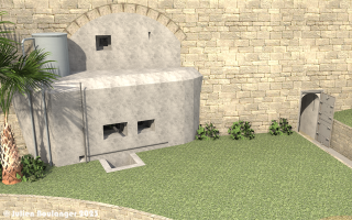 Derrière et à droite de la porte du bloc, vu de l'extérieur, il y avait selon les sources une petite cantine et un abri en tôle métro comme cantonnement de temps de paix des défenseurs. Mon hypothèse est donc que ce réservoir placé sur la dalle du bloc était probablement le château d'eau de la cuisine et de l'abri.