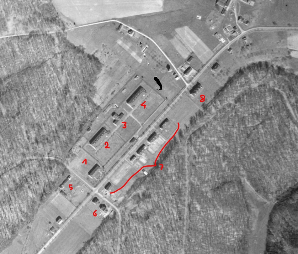 Plus à gauche, deux maisons (6) probablement réservées aux officiers supérieurs et face au camp, une série d'immeubles de logement collectif (7)