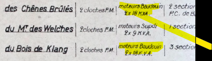 Les états d'avant-guerre confirment 2 Baudouin de 18 kVA. C'étaient des abris de taille importante avec Chenes Brulés, qui méritaient bien cette puissance.