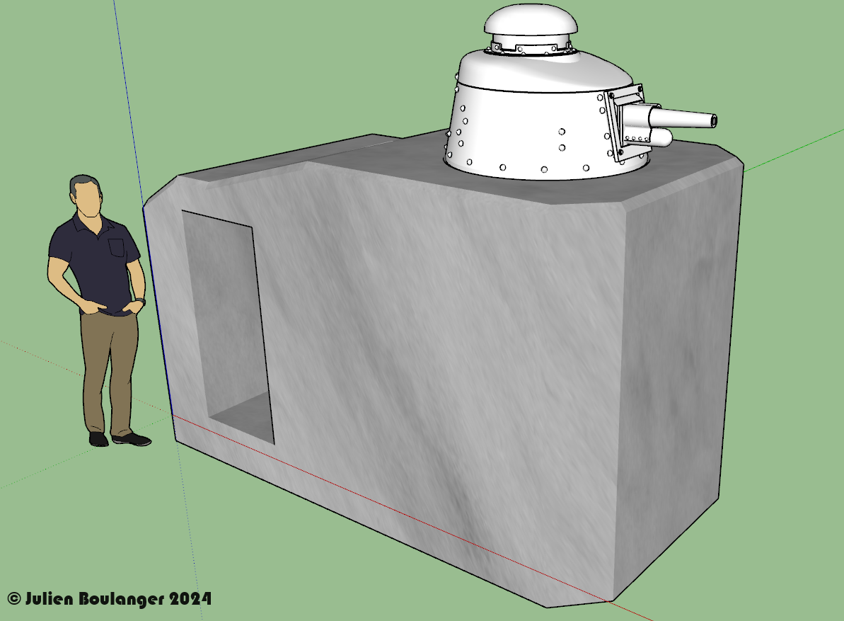 Je rebondis sur ce fil à propos du diamètre de la cuve. Ayant également relevé les mesures de ce petit bloc de béton caché dans les ronces récemment, j'ai téléchargé un modèle de char FT et récupéré la tourelle pour voir l'installation étant donné qu'il ne s'agit que d'une hypothèse. La tourelle rentre pile poil dans l'espace (95 cm de diamètre, environ 110 cm si on compte le léger rebord) sous réserve que les dimensions à l'échelle 1 de la tourelle soit respectée. On pourrait aisément imaginer que le rebord serve de support à une collerette boulonnée au blockhaus (d'où les tiges), permettant de faire tenir la tourelle.