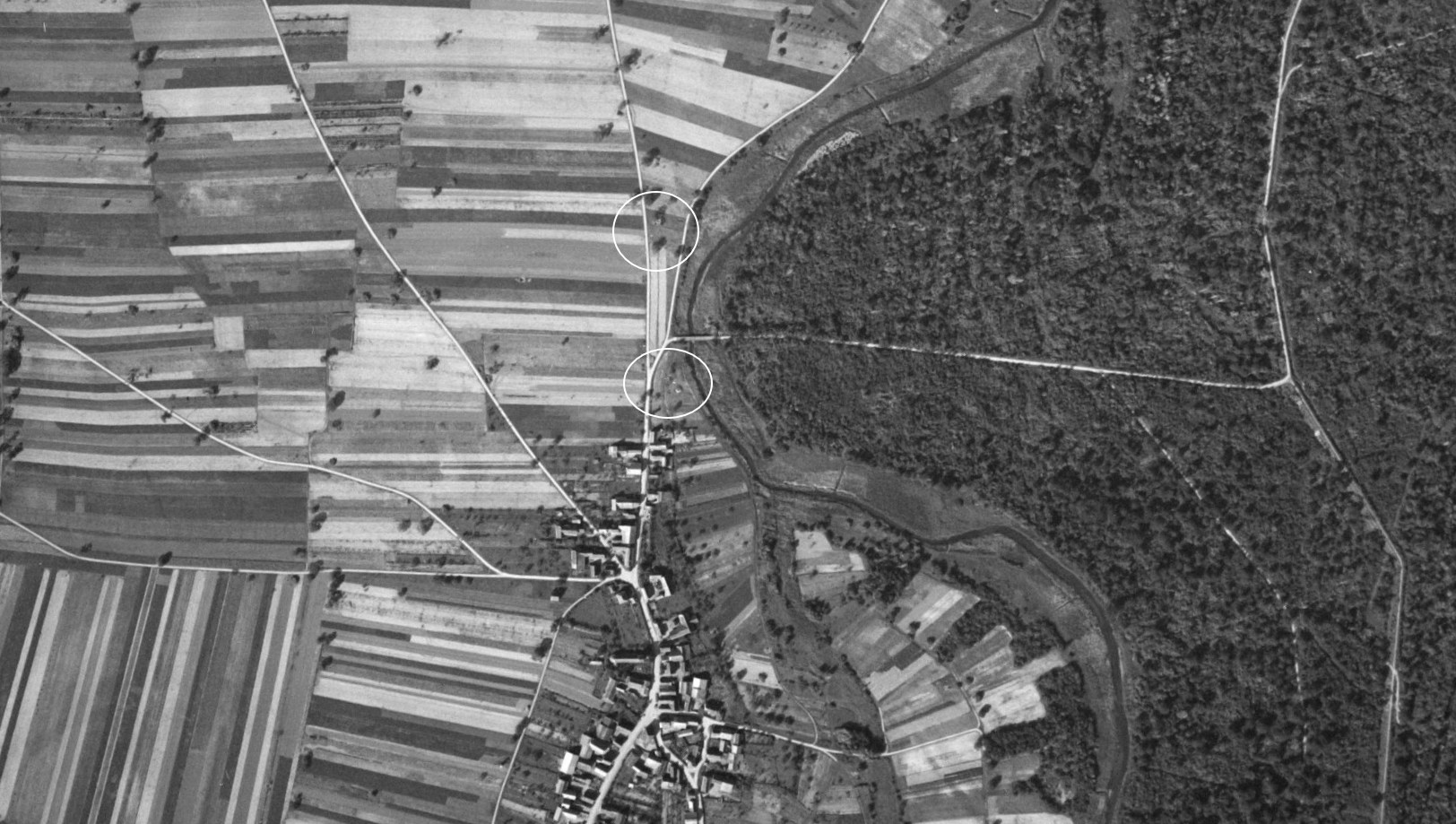 sur la carte de 1950 le bloc en bas c'est celui qui se trouve entre deux maison et celui du haut il et en ruine le chemin a gauche n'existe plus