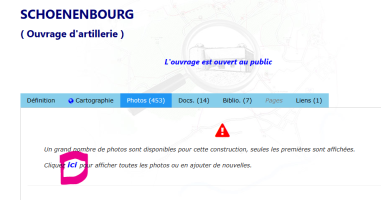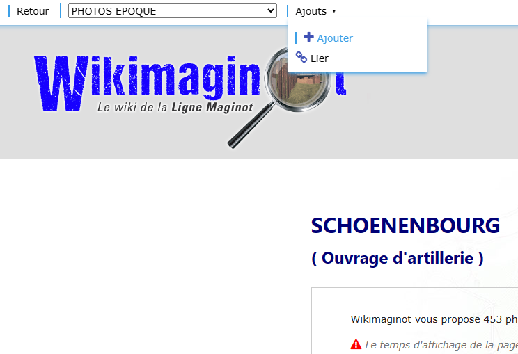Merci de votre proposition. Si c'est un document papier et que vous pouvez le scanner alors vous pouvez téléverser directement par vous même cette photo sur la page du Schœnenbourg dans l'onglet "photo". Pour cela, il suffit d'aller dans cet onglet, puis d'afficher l'ensemble des photos (copie d'écran 1) et enfin sur "Ajout / +" (2e copie d'écran)