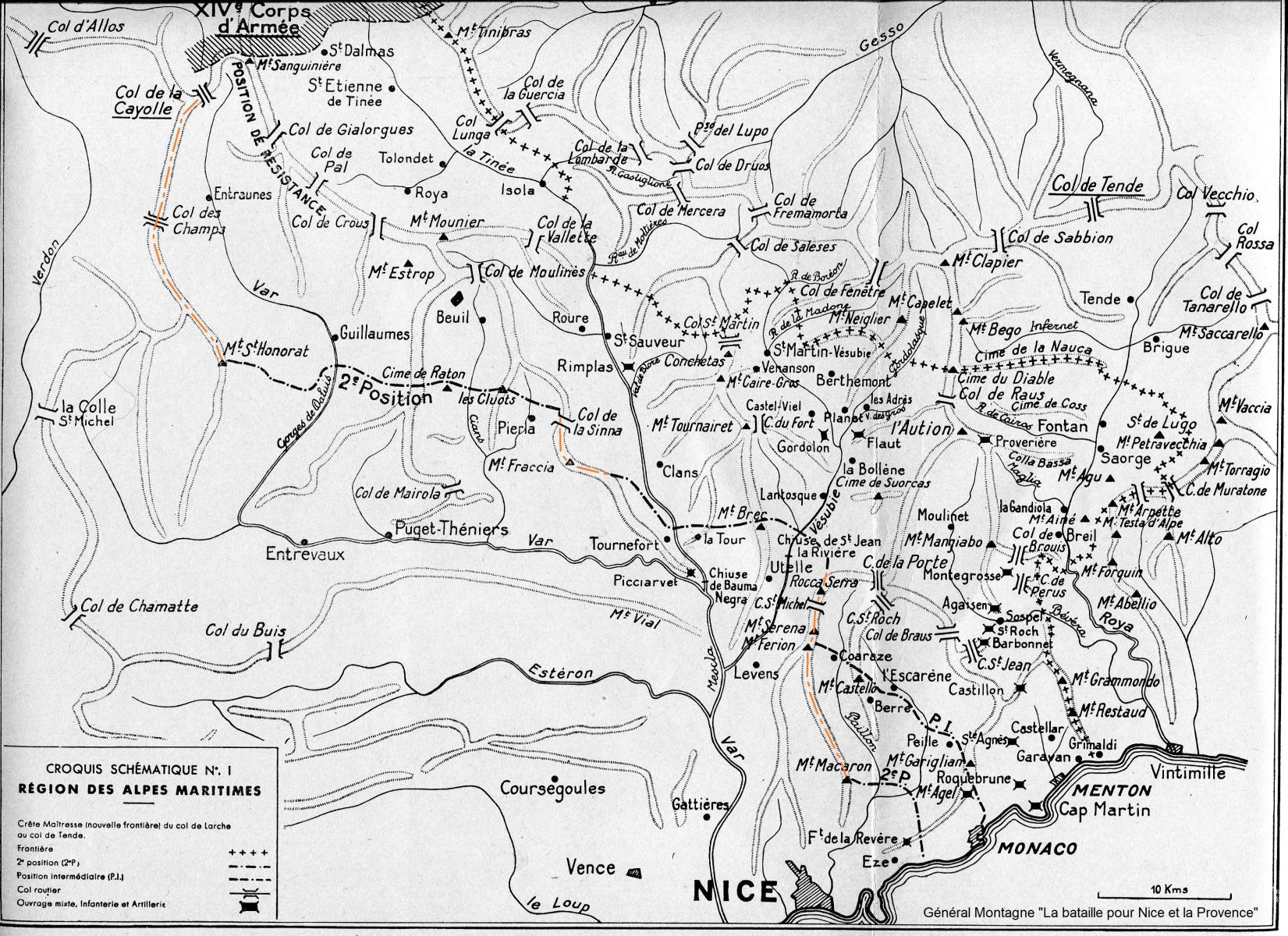 La deuxième position est bien détaillée par Montagne et elle est principalement le long des lignes de crête entre la limite du XIV° CA (col de la Cayolle) et la mer (Eze) à une distance d’environ 5 à 10 km de la PR.