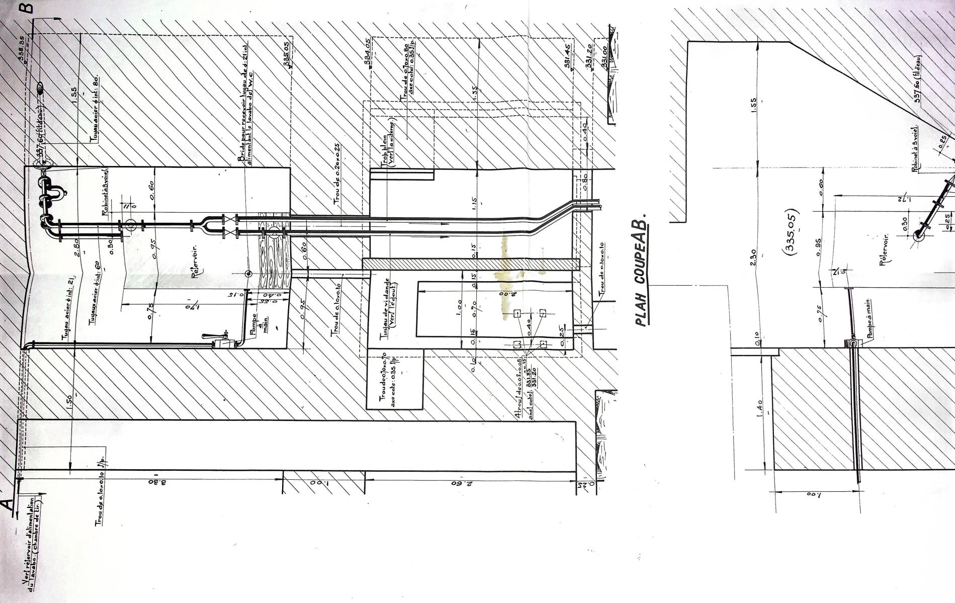 Une fois de plus la configuration actuelle est trompeuse , car les cheminements de tuyauteries ont été modifiés sans prévaloir s'il s'agit d'une modification militaire d'après-guerre ou l'oeuvre de l'association. Initialement cette pompe est directement reliée au réservoir via le piquage que l'on voit sur la photo est qui pénètre dans la dalle. Cette pompe servait donc au relevage pour remplissage du réservoir (journalier) d'alimentation du lavabo de la chambre de tir.