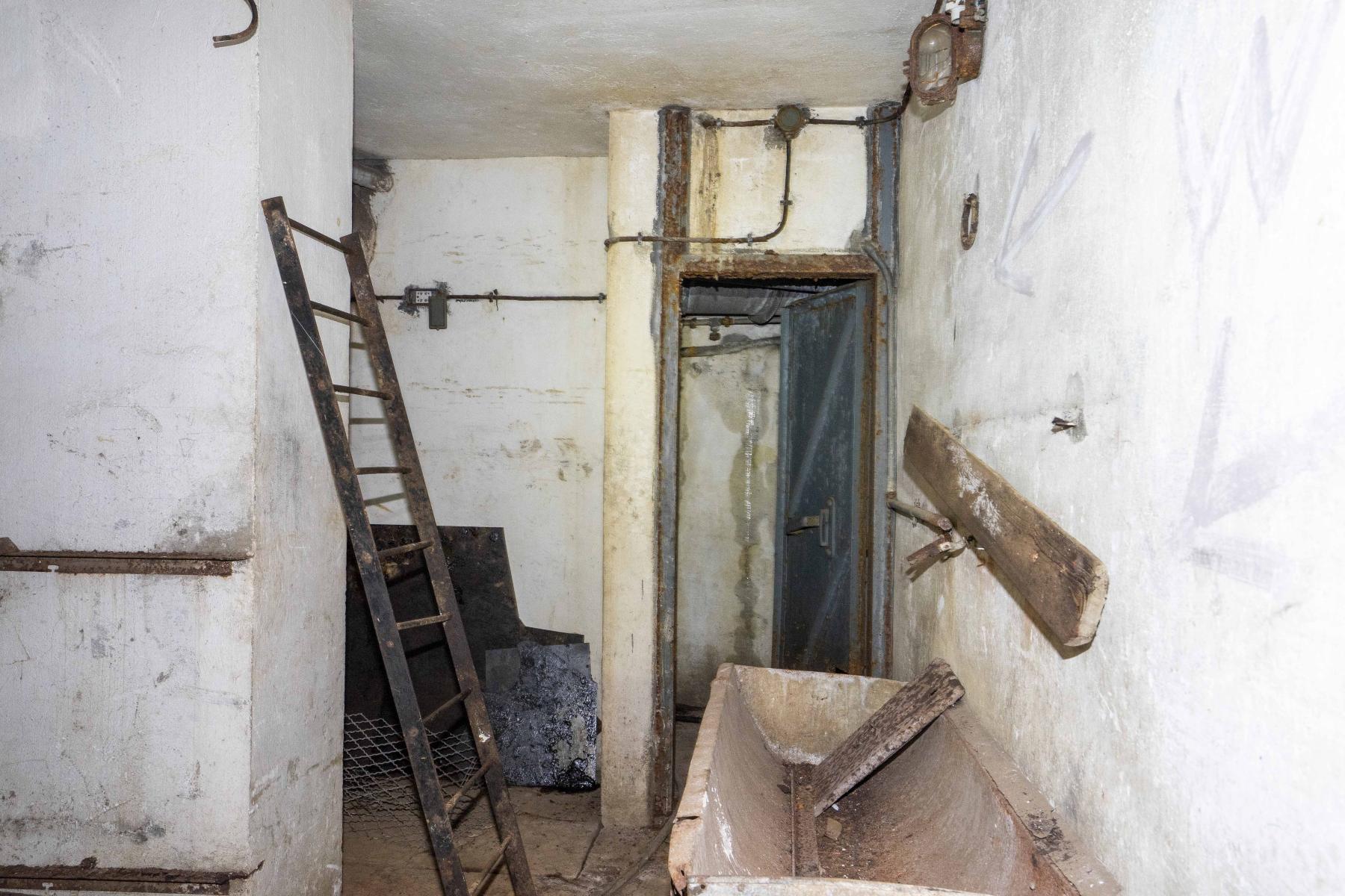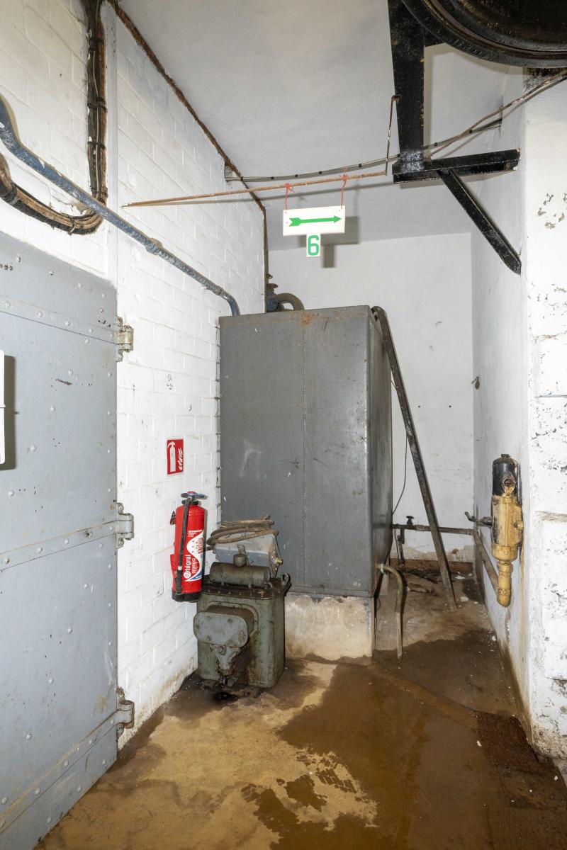 Bloc 4, photo n°235. Une idée de la fonction de cette pompe Cady ? Au vu de la couleur noir j'ai pensé à une pompe à gasoil mais je n'en voit pas l'utilité ici. Cette pompe est bien située au couloir de l'étage supérieur desservant les monte-charges ?