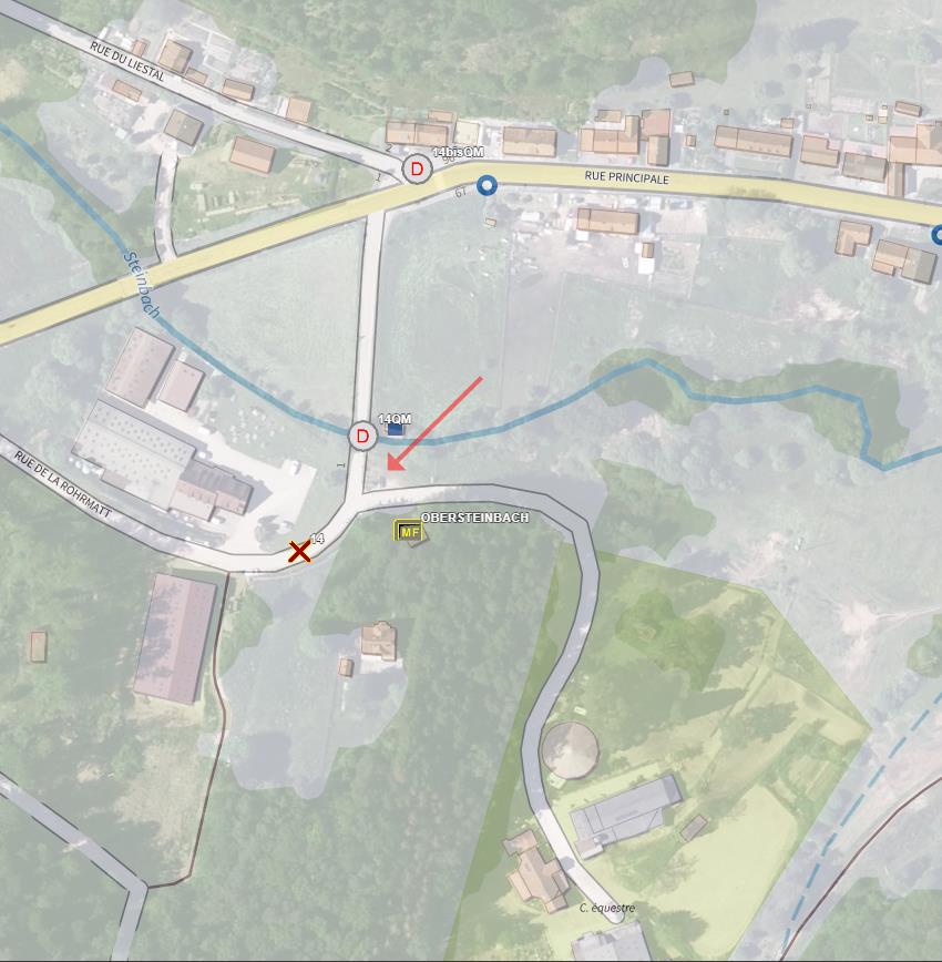 Je voudrais suggérer une petite correction de position concernant la Festes Haus Obersteinbach. Le MF se trouvait dans le gousset de passage à quelques mètres au nord du point marqué sur la carte (voir flèche rouge sur mon croquis). Cela se voit également sur les vieilles photos des Américains.