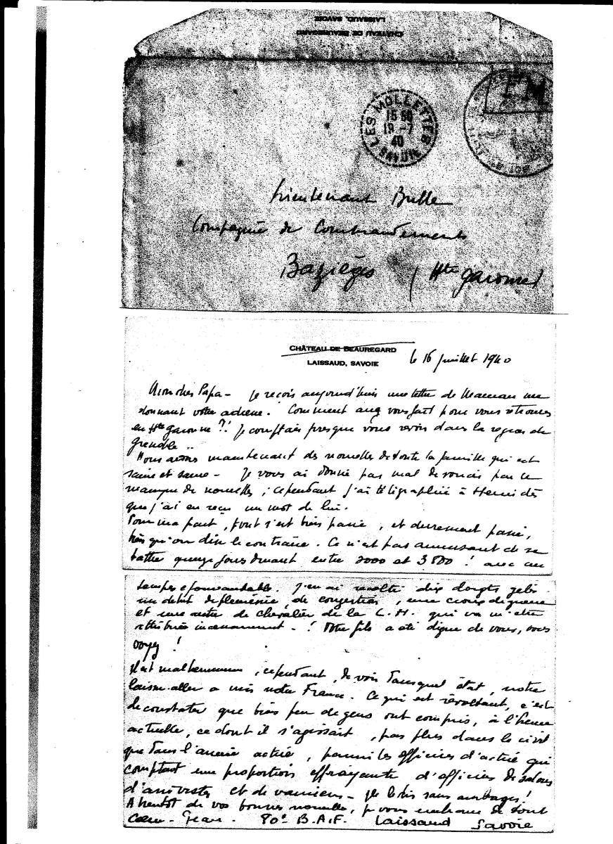 - transfert de la copie numérique de l'original de la lettre perso envoyée par le Lt Bulle à son père (lieutenant de Réserve et ancien combattant de 14, blessé au feu, mais remobilisé en 38 puis en 39 -volontaire- malgré ses 6 enfants). Elle offre la mesure de l'etat d'esprit du Lt suite aux conditions physiques des combats. (Bulle était asthmatique et soufrira toute sa courte vie de problèmes pulmonaires) . Vous y retrouverez sans doute une phrase citée par M. Emprin (Melle Simone Bulle disposait d'une copie (fidèle ) manuscrite de cette missive, qui a été récupérée par la suite. M. Emprin se garde bien de mentionner que cette lettre est signée "JEAN" tout court, et non pas Jean-Marie. Question de bonne foi, ou d'honnêteté: faire prévaloir la présentation que l'on veut donner de Jean Bulle, y compris des assurances sur ce qu'il aurait choisi lors des événements d'Algérie ....