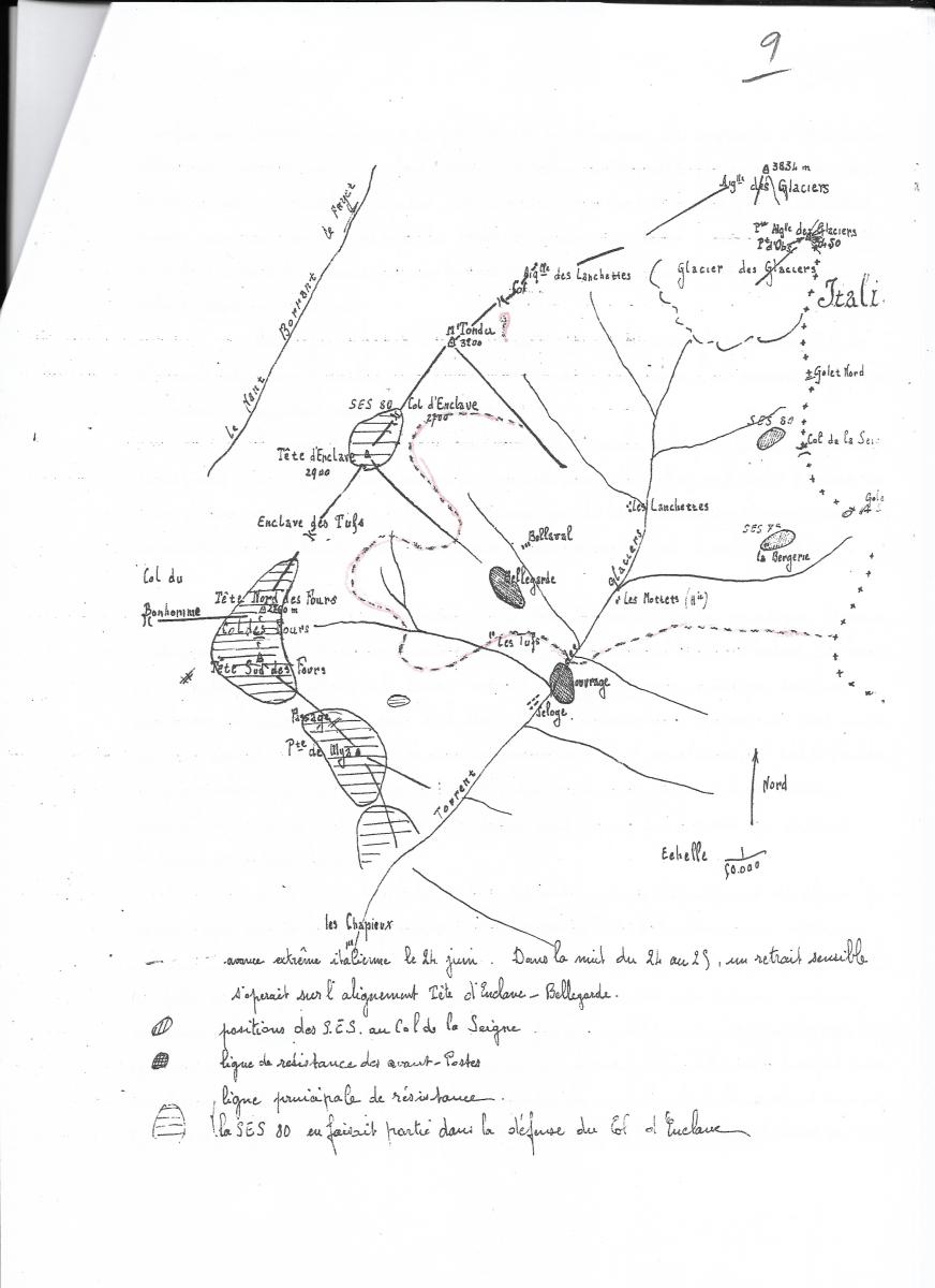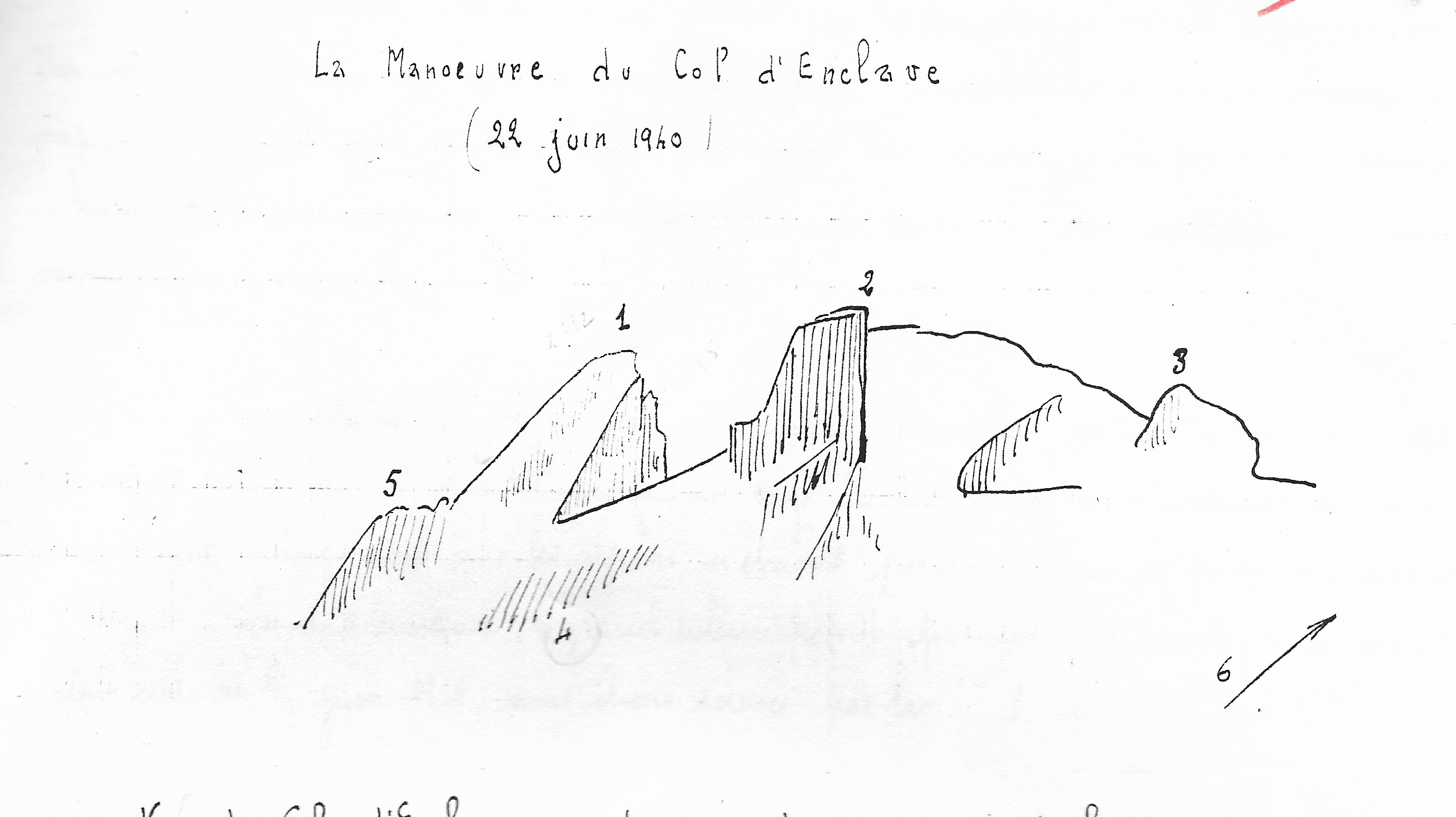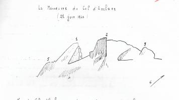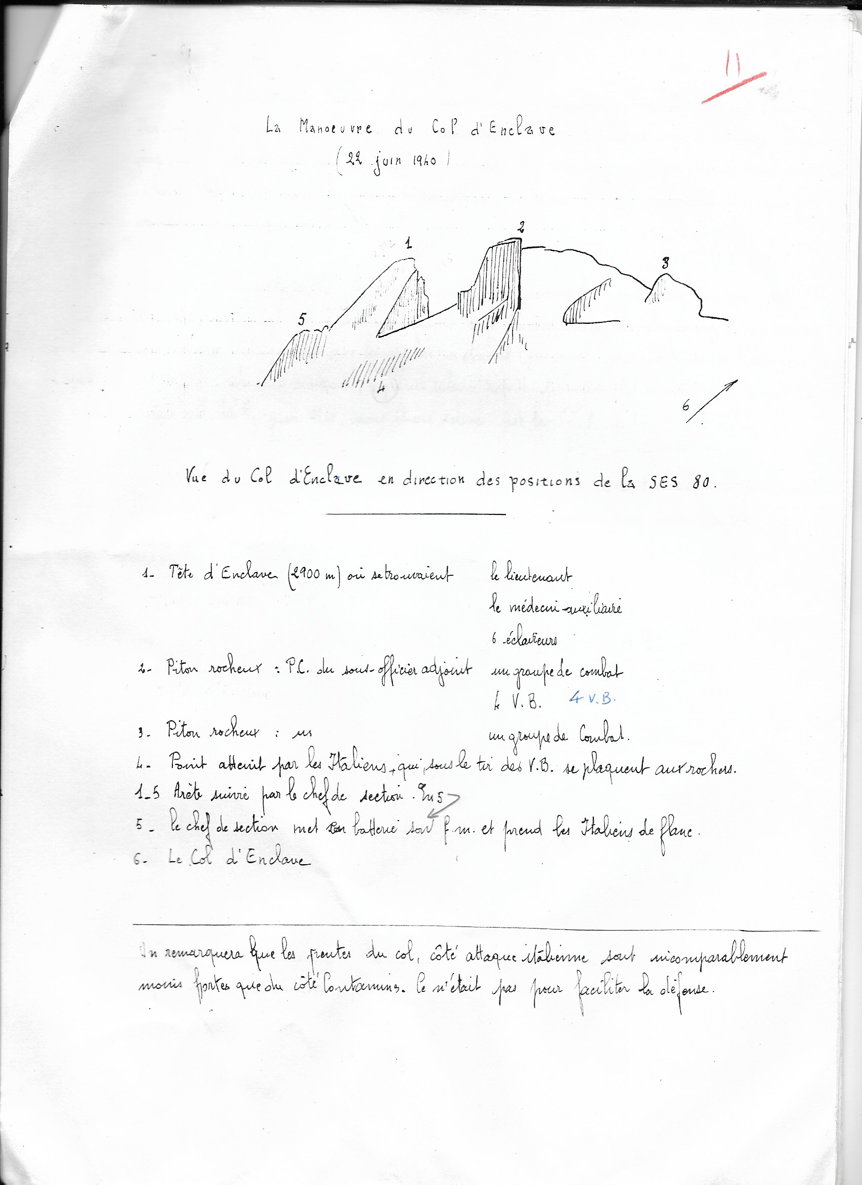 - des copies partielles d'un document soigneusement rédigé au calme par Bulle en 1941, pendant son temps un peu plus libre lors de son affectation transitoire à Grenoble. Croquis ou il explique lui-même son action au col d' Enclave, et une photo de ces positions, prise pendant une montée au Col et donc en passant au pied des lieux mêmes dessinés par Bulle. Ce document est signé "J. BULLE" sans aucune autre mention.