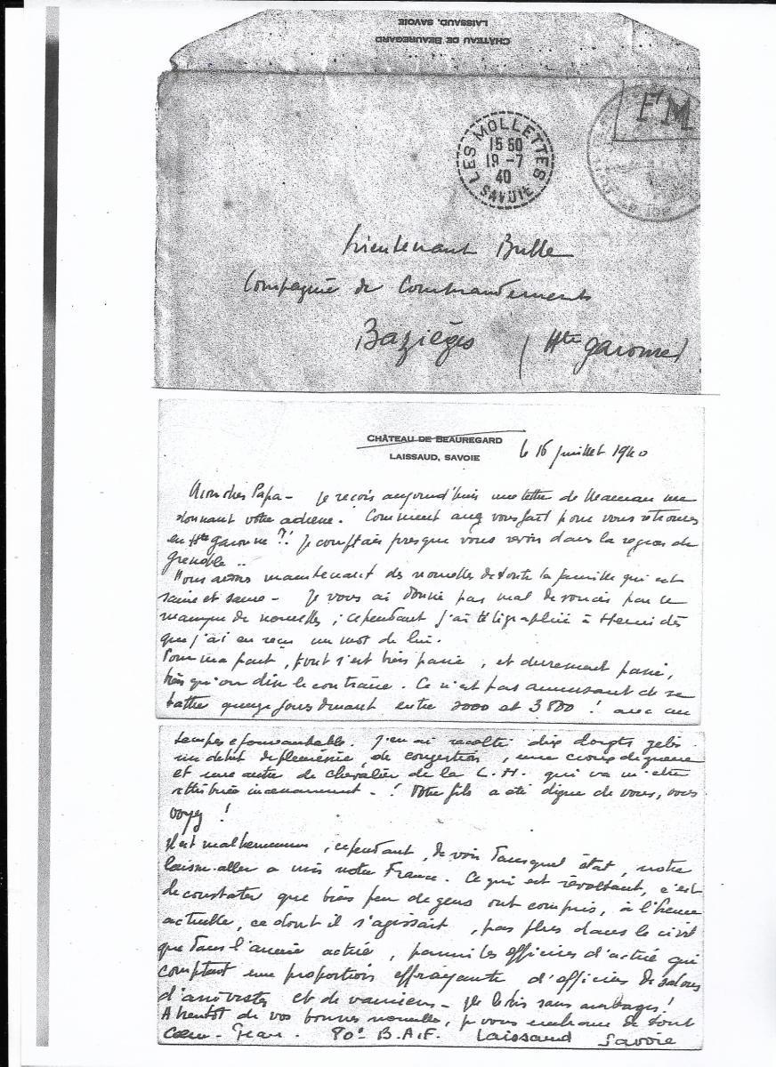 - transfert de la copie numérique de l'original de la lettre perso envoyée par le Lt Bulle à son père (lieutenant de Réserve et ancien combattant de 14, blessé au feu, mais remobilisé en 38 puis en 39 -volontaire- malgré ses 6 enfants). Elle offre la mesure de l'etat d'esprit du Lt suite aux conditions physiques des combats. (Bulle était asthmatique et soufrira toute sa courte vie de problèmes pulmonaires) . Vous y retrouverez sans doute une phrase citée par M. Emprin (Melle Simone Bulle disposait d'une copie (fidèle ) manuscrite de cette missive, qui a été récupérée par la suite. M. Emprin se garde bien de mentionner que cette lettre est signée "JEAN" tout court, et non pas Jean-Marie. Question de bonne foi, ou d'honnêteté: faire prévaloir la présentation que l'on veut donner de Jean Bulle, y compris des assurances sur ce qu'il aurait choisi lors des événements d'Algérie ....